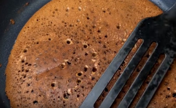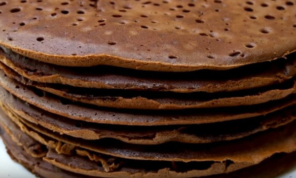 5. Немного смазываем сковороду маслом и начинаем обжаривать коржи. Делаем это на среднем огне, после того как Вы распределили тесто по всей сковороде, накройте её крышкой и ждите пока не появятся дырочки в корже и сверху не будет сырого теста. Далее переворачиваем корж и готовим ещё 1 мин. Снимаем «блинчик» и проделываем аналогичную процедуру со всем тестом.