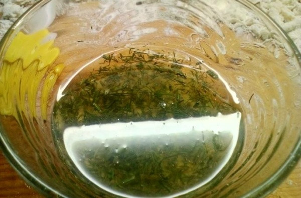 4. Тем временем готовим заливку. Чеснок выдавливаем через пресс, к нему всыпаем 1/2 ч. л. соли, перетираем, а потом вливаем растительное масло (2-3 ст. л.). Укроп мелко рубим и также вносим к соусу.