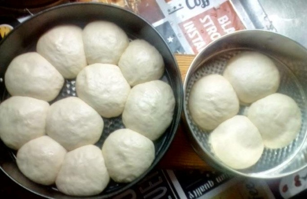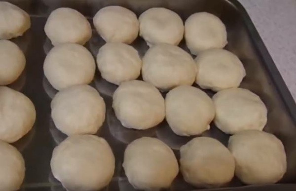 3. Подошедшее тесто перекладываем на стол смазанный маслом и ещё немного приминаем его. Далее катаем шарики. Делать это можно удобным для Вас способом: укатывать на столе, укатывать в руках или выдавливать шарики из общего объёма заготовки. Сформированные булочки выкладываем на противень и даём им расстояться 10-15 минут.