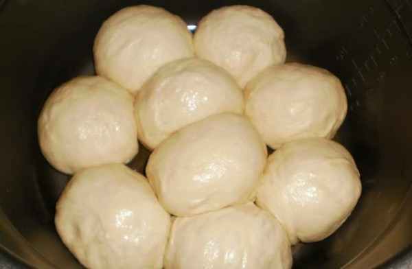 4. Разделяем заготовку на равные части и придаём им форму шара. Вкладываем их в разогретую чашу мультиварки и закрываем крышкой. Выпекаем в режиме «выпечка» 50 минут. Не забудьте открыть клапан пара.