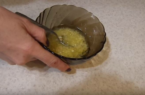 5. Тем временем разогреваем духовку до 180 градусов и делаем чесночную начинку. В небольшую миску выдавливаем чеснок и наливаем 1 ст. л. растительного или оливкового масла, также рекомендую немного подсолить. Всё перемешиваем и пока отставляем в сторону.