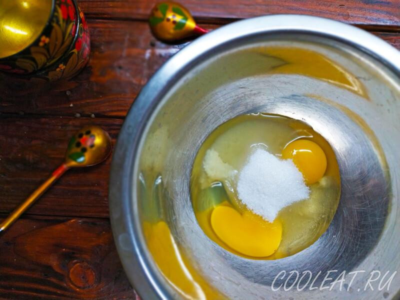 Шаг 1. Первым делом вбиваем яйца в миску и всыпаем к ним сахар и соль. Хочу сказать сразу, что неважно какими будут яйца по температуре. Можете использовать прямо с холодильника. Просто большинство рекомендует дать прогреться продукту до комнатной температуры. Хотя по сути это ничего не даёт, по крайней мере в данном рецепте.