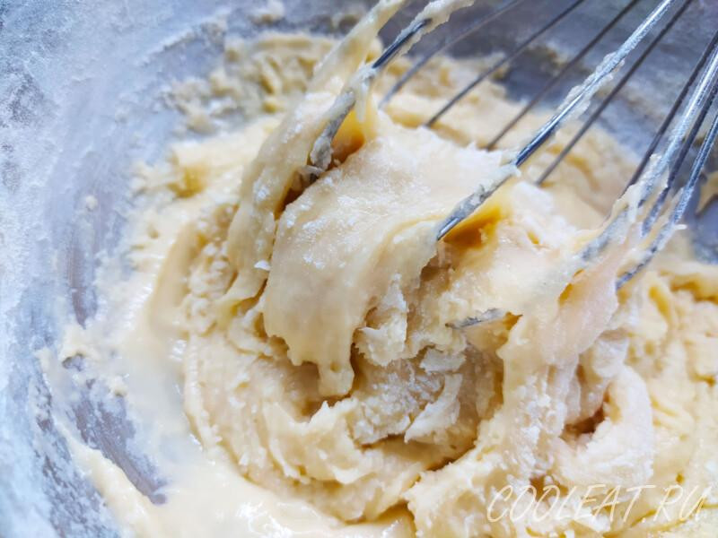 Шаг 3. Как получили нужную массу, начинаем постепенно добавлять муку и замешивать густое тесто. Да, именно густая основа нам нужна на данном этапе. Ниже скажу, зачем это делается.
