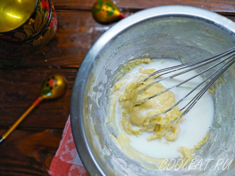 Шаг 5. Сделали густое тесто, начинаем вводить молоко. Тут даже можно влить всё сразу, ведь в любом случае мучной комок разойдётся по жидкости. Просто главное следить за консистенцией. По густоте заготовка должна получиться довольно жидкая.
