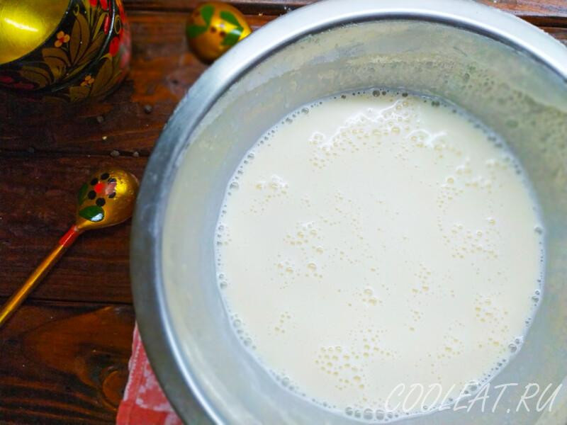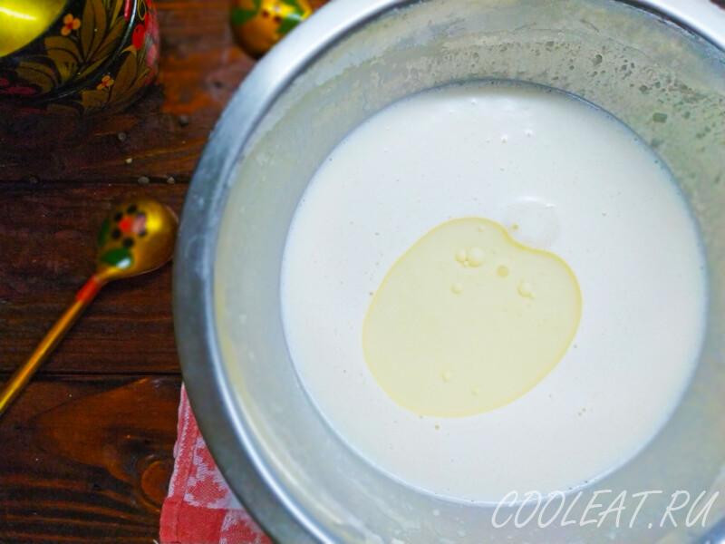 Ну а теперь расскажу зачем мы всё делали именно по такой схеме. Дело в том, что если вносить муку в молоко, то высока вероятность образования комков. Точнее их потом тяжело будет разбить. А когда мы вначале замешиваем густое тесто, то в дальнейшем его остаётся только разбавить до нужной густоты. Комков при это не будет совсем!