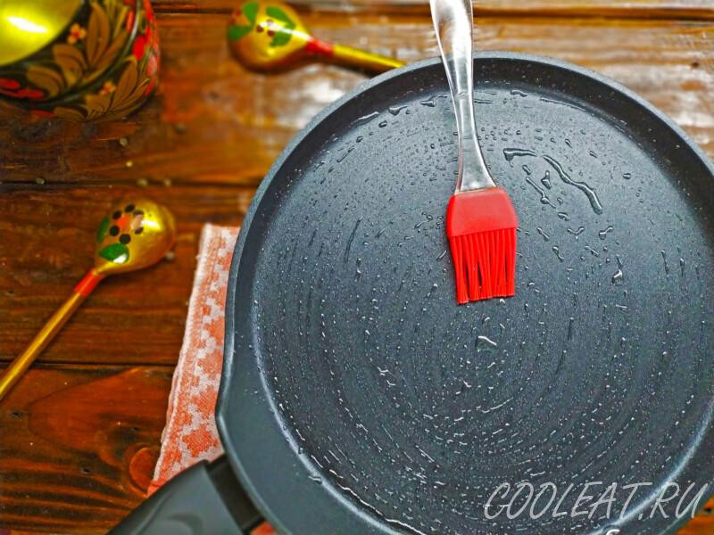 Шаг 8. Устанавливаем на плиту сковороду и смазываем её единоразово каплей масла. В дальнейшем нет необходимости промазывать дно тары жиром, потому как он присутствует в самом тесте. Значение огня сразу выставляем среднее.