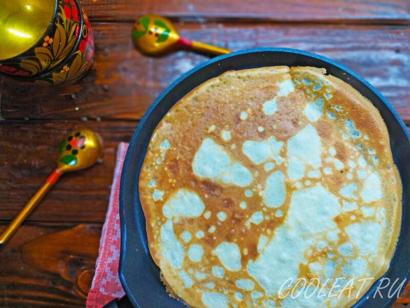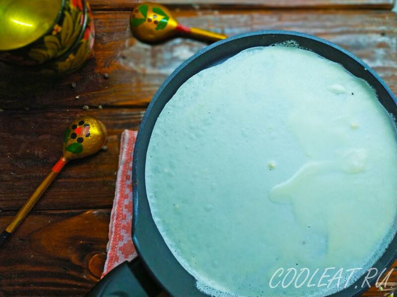 Выпекается изделие с первой стороны примерно 30-40 секунд. До момента пока его края не начнут темнеть или отходить от сковороды. Ещё готовность определяется по застывшим тесту на поверхности блина.