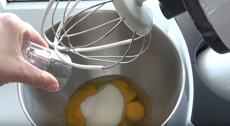 2. Пока опара подходит, займемся другими ингредиентами. В емкость отправляем яйца, желтки, весь сахар и соль. Далее берем миксер и начинаем взбивать до тех пор, пока сахар и соль полностью растворятся.