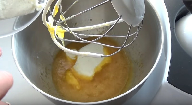 3. Когда яичная масса стала однородной, туда закладываем творог. Повторяем процедуру взбивания, чтобы смесь получилась гладкая, без комков.