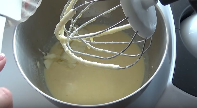 4. Следующая составляющая, которую будем добавлять — сливочное масло. Оно должно быть обязательно мягким, а не только что из холодильника. Поэтому достаньте его за 2-3 часа и дайте постоять. Продолжаем все взбивать до однородности.