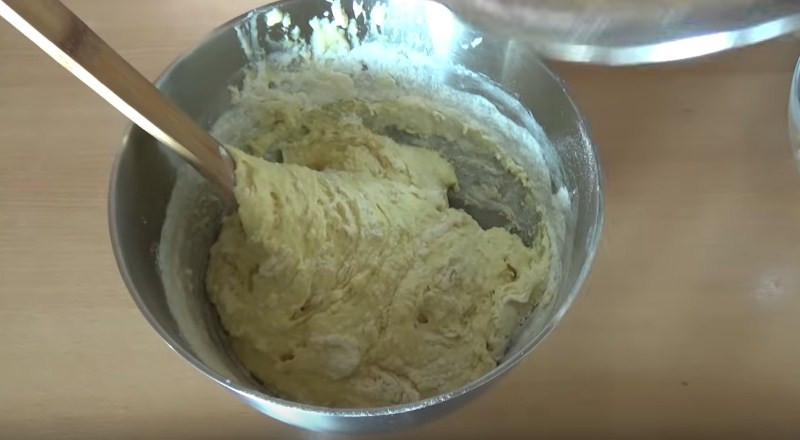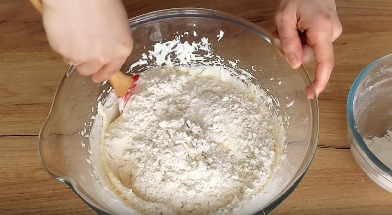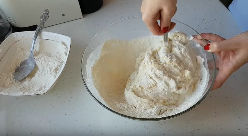 6. Когда две массы соединились между собой начинаем добавлять муку. Ее заранее просеиваем и добавляем небольшими порциями. Сначала вымешивайте ложкой или лопаткой. А когда тесто становится очень густым, его лучше переложить на стол, обсыпать остатками муки и продолжить замешивать руками.