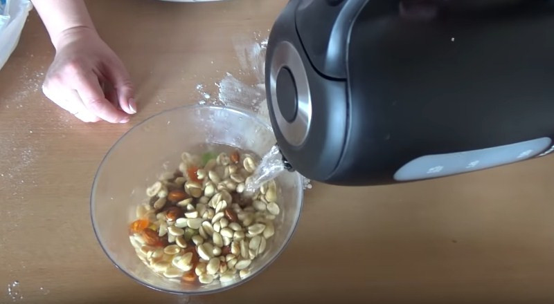 7. Пока не теряем времени и занимаемся вкусными дополнениями. Будем использовать изюм, арахис и цукаты. Их сначала промываем холодной водой, затем заливаем кипятком и даем постоять 10-15 минут. Затем жидкость сливаем, а все остальное просушиваем полотенцем.