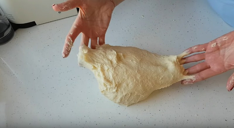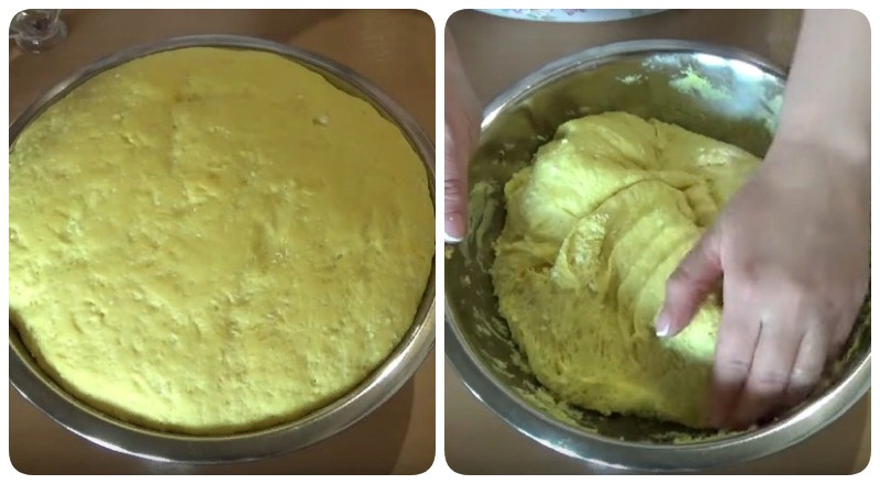 10. Спустя 1,5 часа тесто поднимется и увеличится в объеме в 2,5 раза. Его нужно будет хорошо обмять, заранее обработав руки растительным маслом.