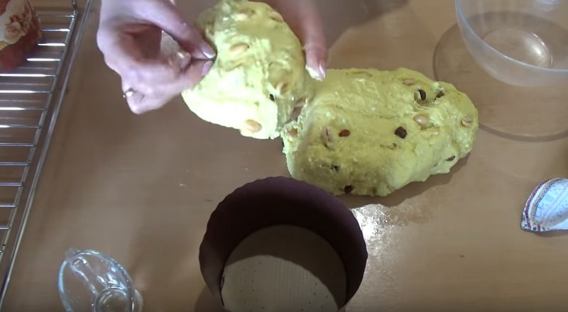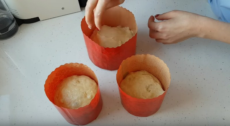 11. Полученную основу делим примерно на 3 равные части и выкладываем в формы. Заполнять их нужно не больше чем на половину, т.к. при дальнейшей расстойке масса поднимется еще больше. Далее накрываем куличи полотенцем и даем им постоять еще 30 минут.