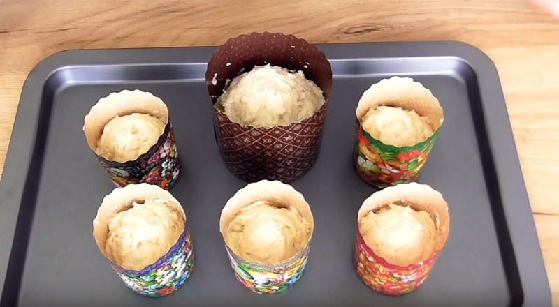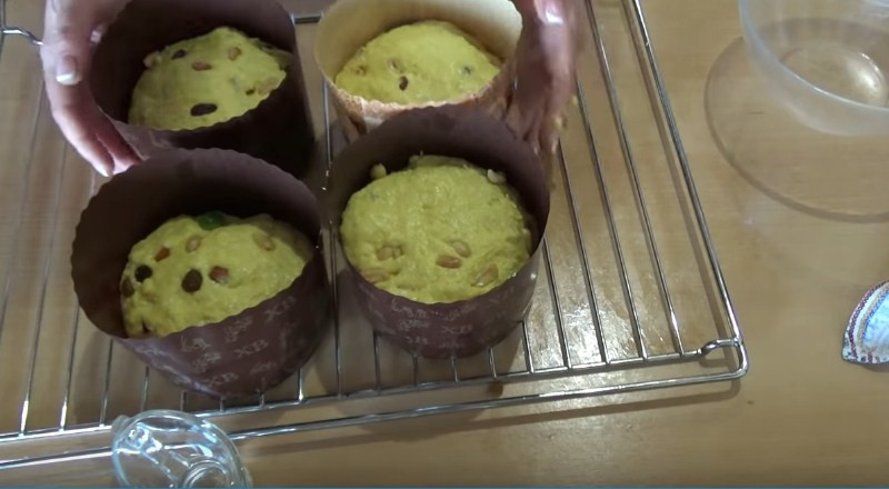 10. Теперь надо оставить куличи на расстойку. При этом накрыть их полотенцем и поставить в теплое место. Занимает эта процедура примерно 40-50 минут. Тесто должно приподняться, но не выше краев формы. Далее лакомство ставим в духовку и выпекаем 40 минут при 180 °С.