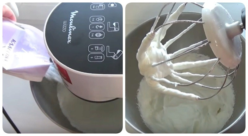 12. Делается крем очень просто. Сливки выливаем в емкость для взбивания, к ним всыпаем сахарную пудру и начинаем взбивать: сначала медленно, затем увеличиваем скорость. В итоге должна получиться плотная, густая масса.