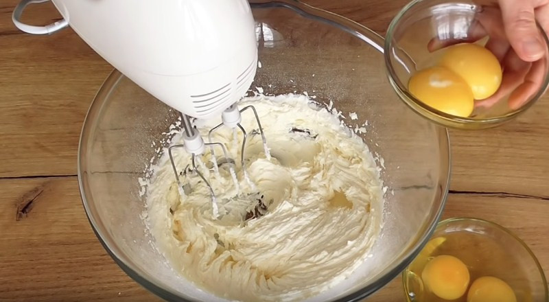 2. Далее к масляному крему нужно по одному вводить желтки, затем яйца (они должны быть также комнатной температуры). При этом продолжаем все активно взбивать.