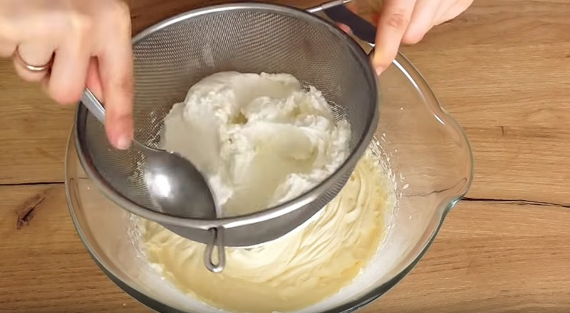 3. Когда масса стала однородной, к ней добавляем творог. Чтобы в тесте не было комочков, его перетираем через сито или хорошо перебиваем блендером, чтобы творог стал пастообразным. Туда же всыпаем ванильный сахар и снова тщательно взбиваем миксером.