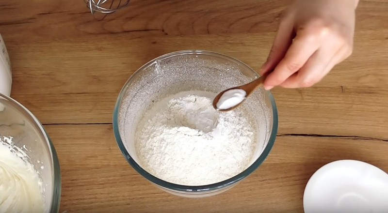 4. Теперь берем отдельную емкость и просеиваем в нее 300 г муки. К ней всыпаем соль и соду. Все сухие ингредиенты перемешиваем ложкой или венчиком.