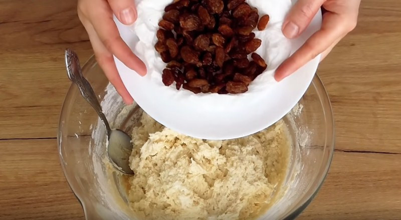 6. Когда основа стала однородной всыпаем к ней изюм. Его предварительно промываем, замачиваем на 10-15 минут в горячей воде. Перед добавлением в тесто его остужаем и обсушиваем при помои полотенца. Вмешиваем ягоду до равномерного распределения.