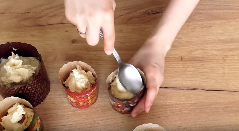 7. Сразу после вымешивания начинаем наполнять формы для выпечки. В этом рецепте они в диаметре 9 см и 6 см. Большие заполняем на 2/3, а те что поменьше на половину объема.