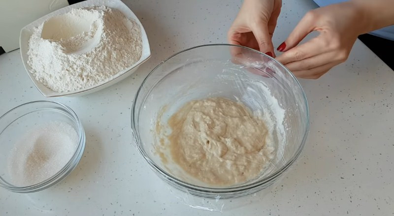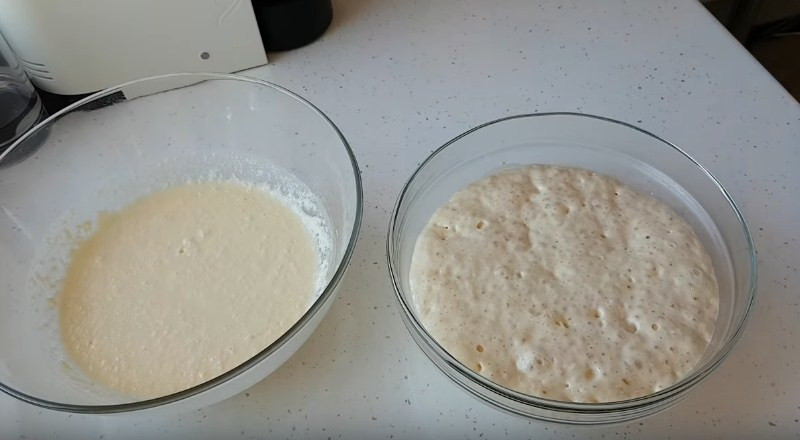 2. Готовую смесь накрываем полотенцем или пищевой пленкой и ставим в темное, теплое место на 15-20 минут, чтобы опара подошла. Через время Вы увидите, что тесто поднялось и увеличилось в объеме.