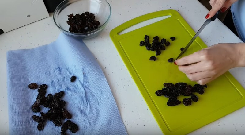 3. Не будем терять время и подготовим изюм. Его сначала хорошо промываем под проточной водой, затем заливаем кипятком и оставляем на 10 минут. По истечению времени воду сливаем и обсушиваем изюм полотенцем. Если ягоды крупные, разрежьте их пополам.