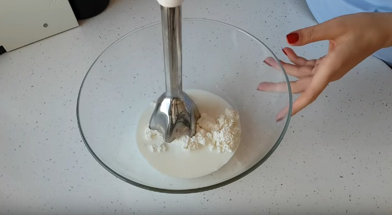 4. Продолжаем заниматься тестом. В емкость высыпаем творог, туда же выливаем молоко и при помощи блендера перебиваем ингредиенты до однородной консистенции. Если у Вас не оказалось на кухне такого помощника, то просто перетрите отдельно творог через мелкое сито. Потом влейте молоко.