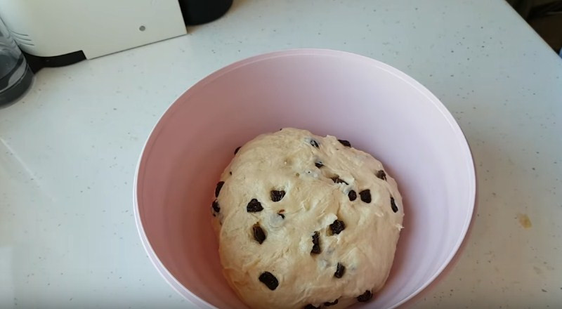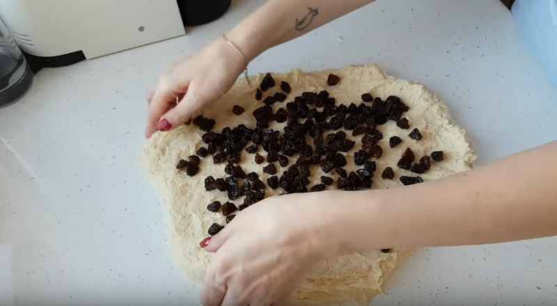 8. Далее тесто немного раскатываем руками и в середину высыпаем нужное количество изюма. Затем сворачиваем края теста конвертом и продолжаем вымешивать до равномерного распределения ягоды в основе.