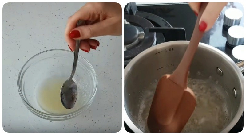 13. Пока лакомство остывает займемся приготовлением глазури. Сначала разводим желатин в воде и оставляем набухать на время, указанное в инструкции. Тем временем в сотейник высыпаем сахар, наливаем воду и варим сироп на среднем огне. Сахар должен полностью раствориться, займет это примерно 2 минуты.