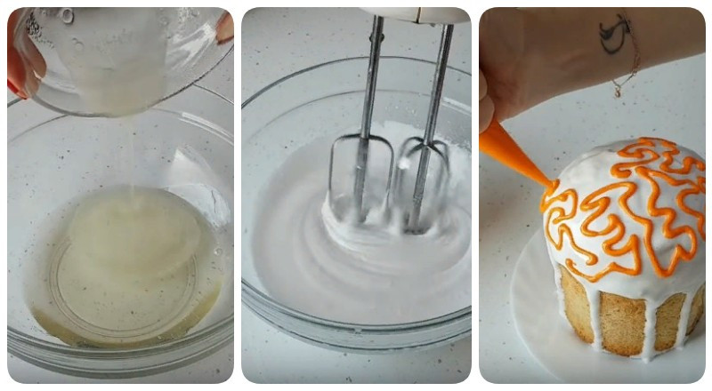 9. Пока лакомство выпекается можно заняться приготовлением глазури. Делать ее максимально просто: чашу выливаем 2 яичных белка, всыпаем 120 г сахара и при помощи миксера взбиваем до образования бархатистой, плотной массы.