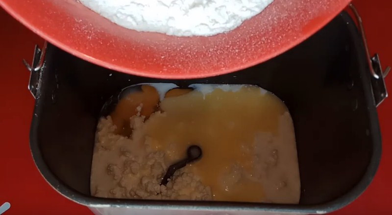 1. Для приготовления важно положить ингредиенты в чашу в правильном порядке. Сначала в емкость выливаем молоко, высыпаем сахар и вбиваем яйца. Следом помещаем творог, ванильный сахар, эссенцию, соль и растопленное сливочное масло. В заключении всыпаем просеянную муку и быстродействующие дрожжи согласно рецепту.