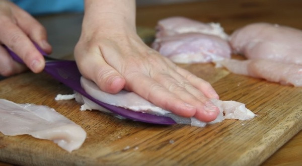 1. Для начала берём куриную, отрезаем от неё малое филе. Больше филе режем на тонкие пласты. В случае с куриными бёдрами, то их надо хорошо отбить.