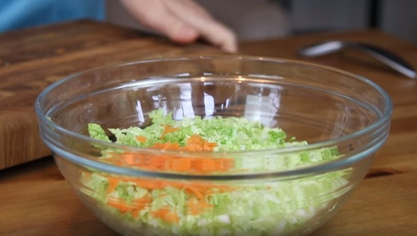 4. Капусту перекладываем в миску, а к ней, для цвета, добавьте мелко нарезанной моркови (можно натереть). Перемешайте и немного подсолите.