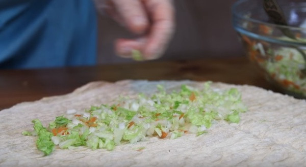 11. Собираем наконец нашу шаурму. Ближе к краю лаваша кладём слой из капусты.