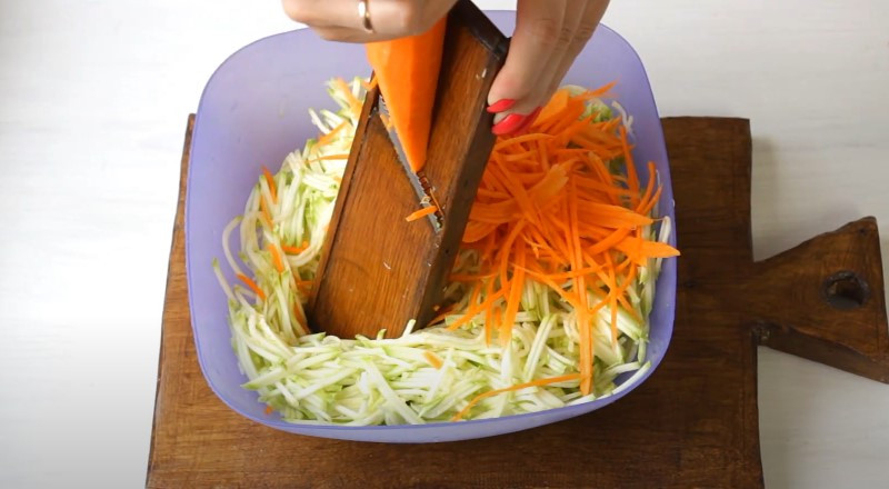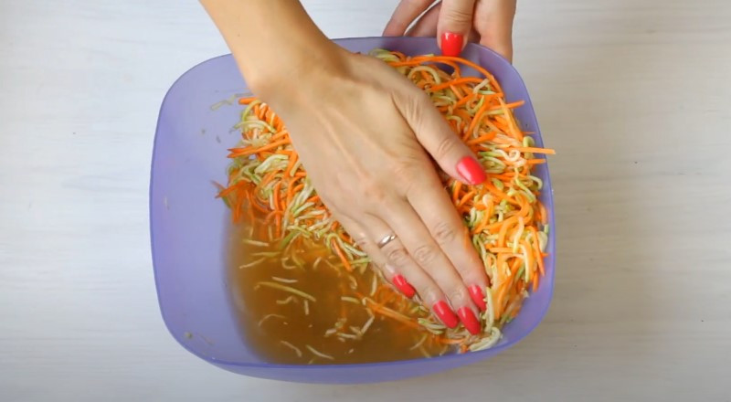 3. Спустя время овощи хорошо дали жидкость и промариновались в собственном соку. В дальнейшем сок нам не понадобится, поэтому сливаем его и слегка отжимаем кабачки с морковью.
