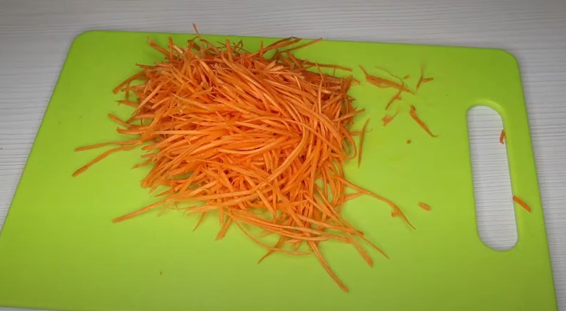 1. Морковь чистим от кожуры и промываем проточной водой. Затем при помощи специальной терки натираем на тонкие полоски.