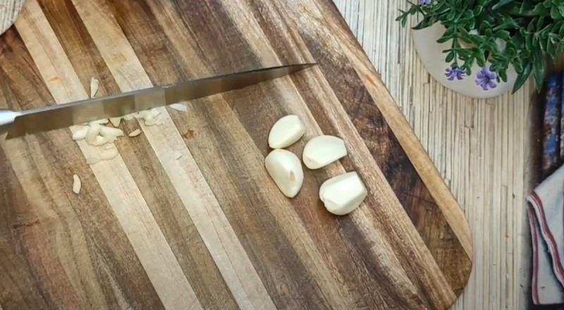 5. Зубчики чеснока чистим и мелко рубим ножом. Если не любите, когда попадаются крупные фрагменты, то измельчите его при помощи терки или пресса.