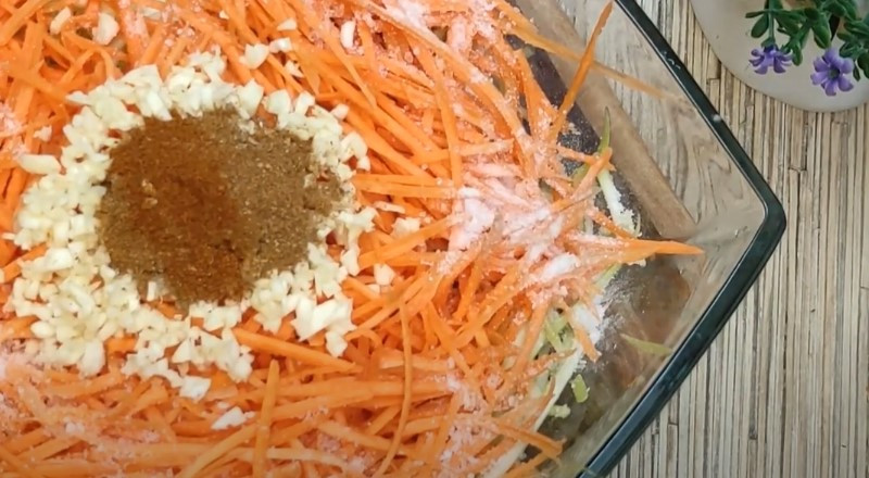 7. Теперь придадим вкус нашей закуске. Добавляем соль, сахар и приправу для корейской моркови.