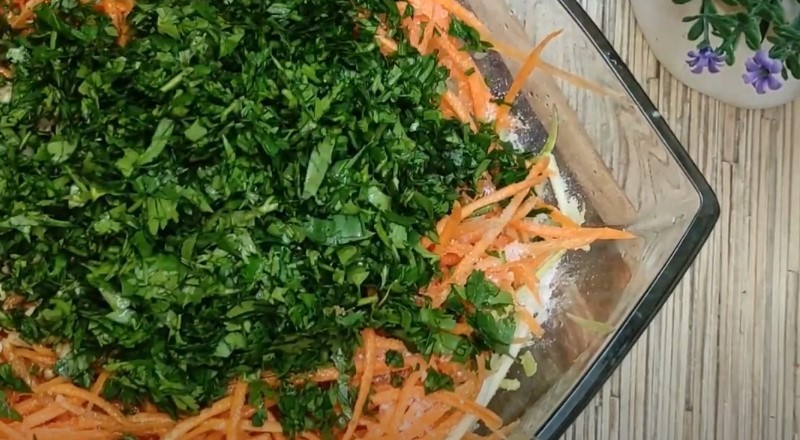 7. Следом всыпаем измельченную зелень и тщательно перемешиваем. На этом этапе можно попробовать закуску и добавить необходимые специи.