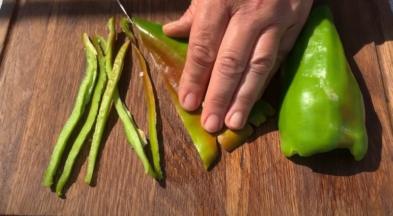 4. Болгарский перец потребуется помыть, вычистить сердцевину и семена. Далее режем тонкой соломкой, чтобы по виду было похоже на морковь и кабачок.