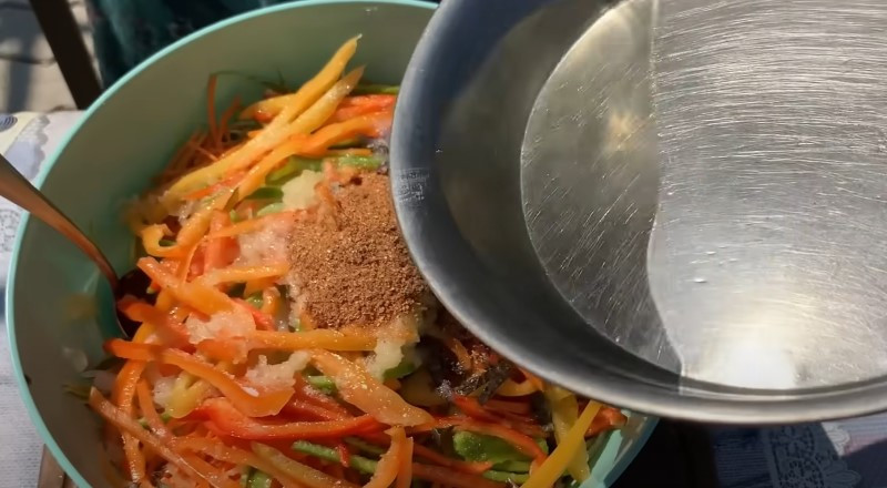9. Далее нужно все тщательно перемешать. После чего попробуйте салат на вкус и добавьте недостающие, по Вашему мнению, специи. Даем закуске постоять при комнатной температуре 2-3 часа, чтобы все овощи хорошо промариновались.