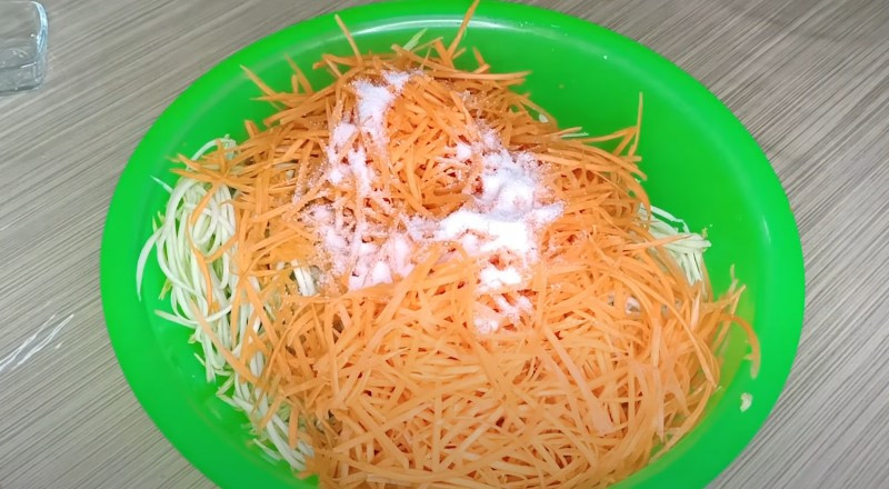 2. Складываем овощи в глубокую миску, добавляем соль и сахар. Все тщательно перемешиваем и даем постоять 30 минут, чтобы кабачок пустил сок.