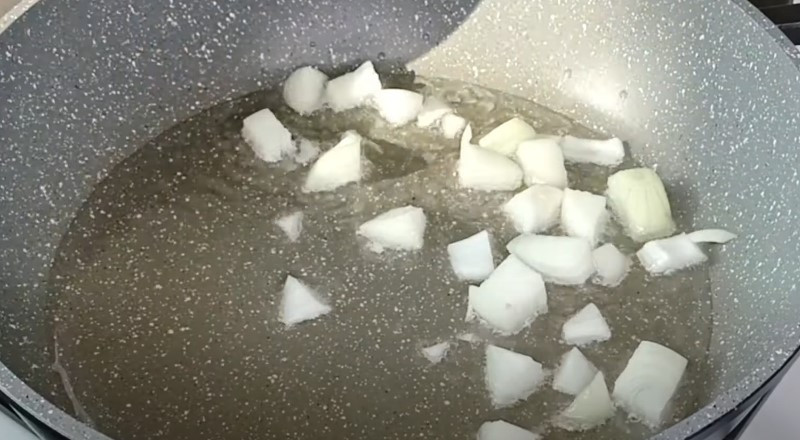 5. Луковицу очищаем и режем на крупные кусочки. После чего отправляем в раскаленное масло и обжариваем до золотистого цвета.
