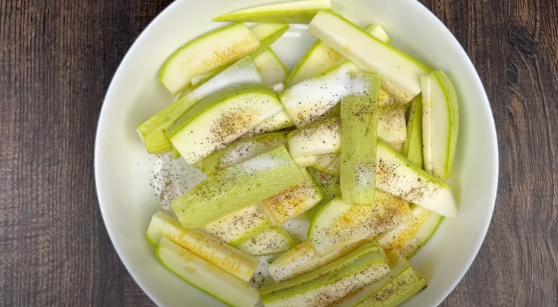 1. Молодые кабачки необходимо помыть и обрезать хвостики. После чего режем овощ на пластинки толщиной до 1 см.