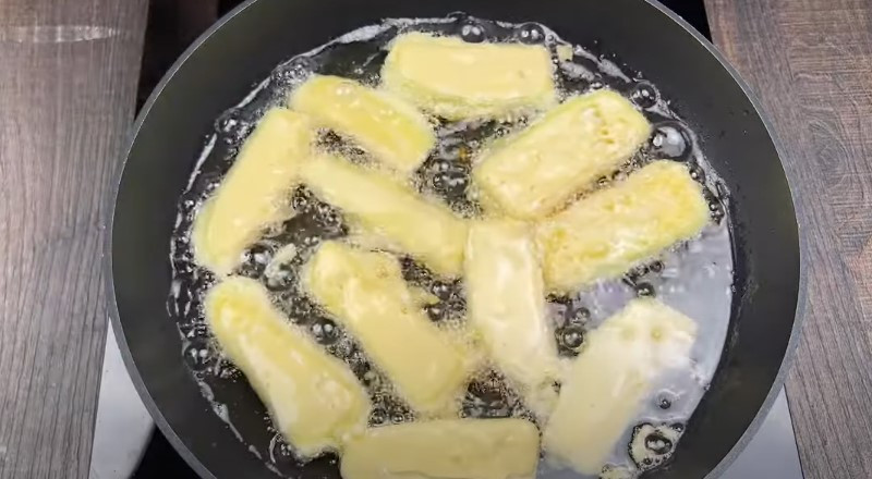 4. Приступим к обжариванию. Каждый ломтик кабачка обваливаем в муке, затем опускаем в кляр и выкладываем на сковороду с раскаленным маслом. Обжариваем с каждой стороны до золотистой корочки.