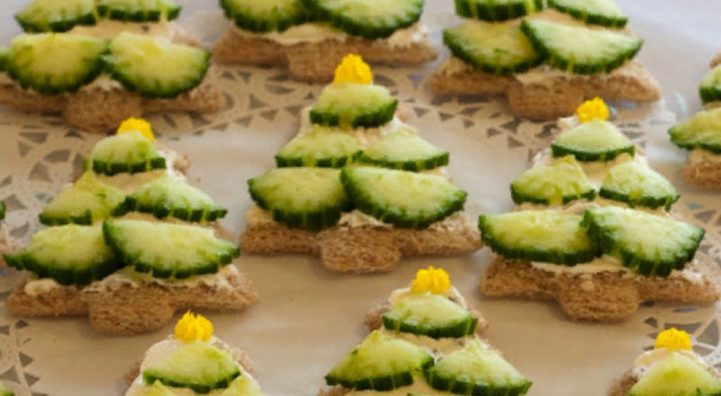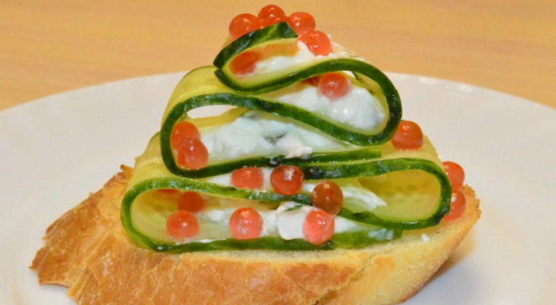 Итак, вот несколько примеров оригинальных бутербродов. Здесь понадобится ломтик багета, сливочный сыр, красная икра и слайс огурца. Получается вот такая нарядная елочка.