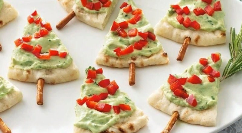 Необычно будет смотреться бутерброд с толстым лавашом. Все просто: его нужно вырезать в виде треугольника, сверху намазать паштетом, сыром или любой другой пастой. Затем сделать гирлянду в виде болгарского перца.