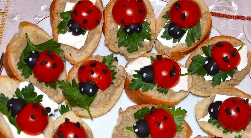 А вот какие симпатичные божьи коровки на подушке из паштета. В приготовлении все просто: туловище букашки — помидор черри, голова и точечки — маслины. Глаза можно нарисовать майонезом.