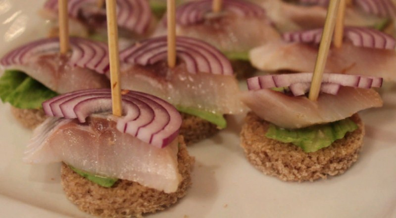 Так же очень часто можно встретить на праздничном вечере канапе. Вот самый простой и бюджетный вариант с черным хлебом, луком и соленой селедкой.